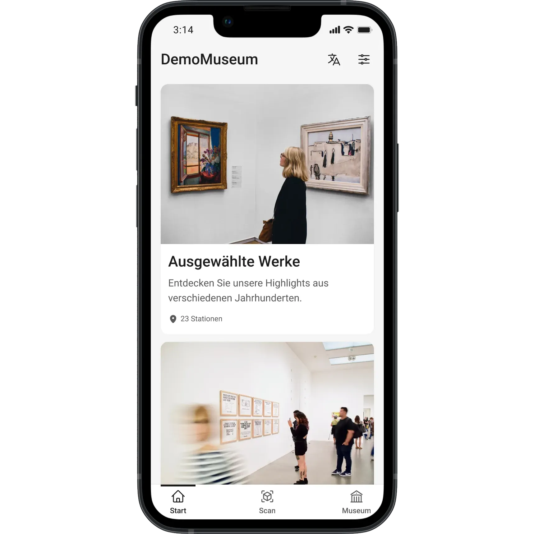Der Audioguide erkennt Kunstwerke automatisch – ganz ohne zusätzliche Markierungen – und liefert direkt die passenden Inhalte. QR-Codes und Nummern sind zusätzlich möglich.